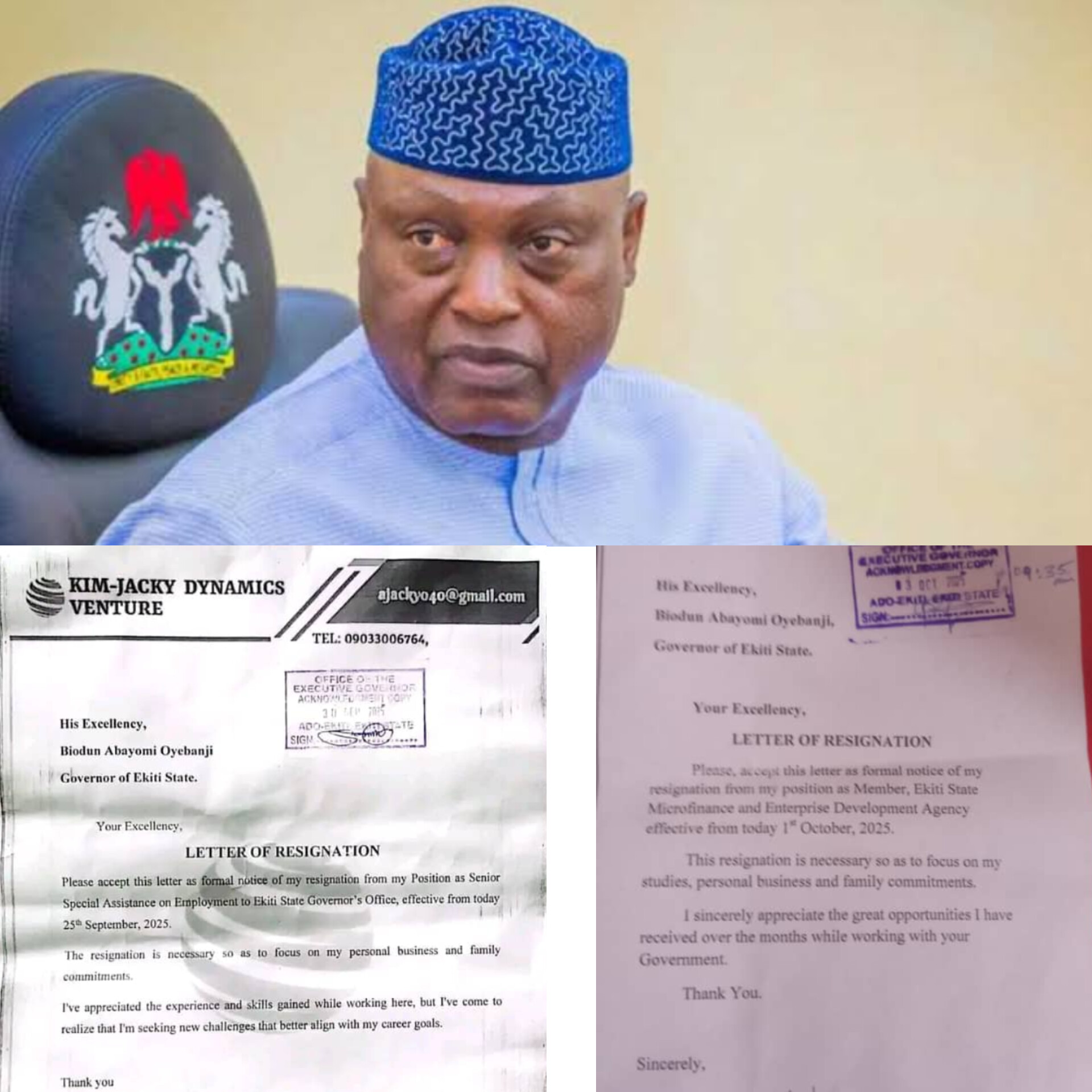 The two letters by Oguntuase and Ogunleye dated September 25, 2025 and October 1, 2025 respectively which were addressed to the Governor, cited personal reasons and family commitments as rationale behind their actions.